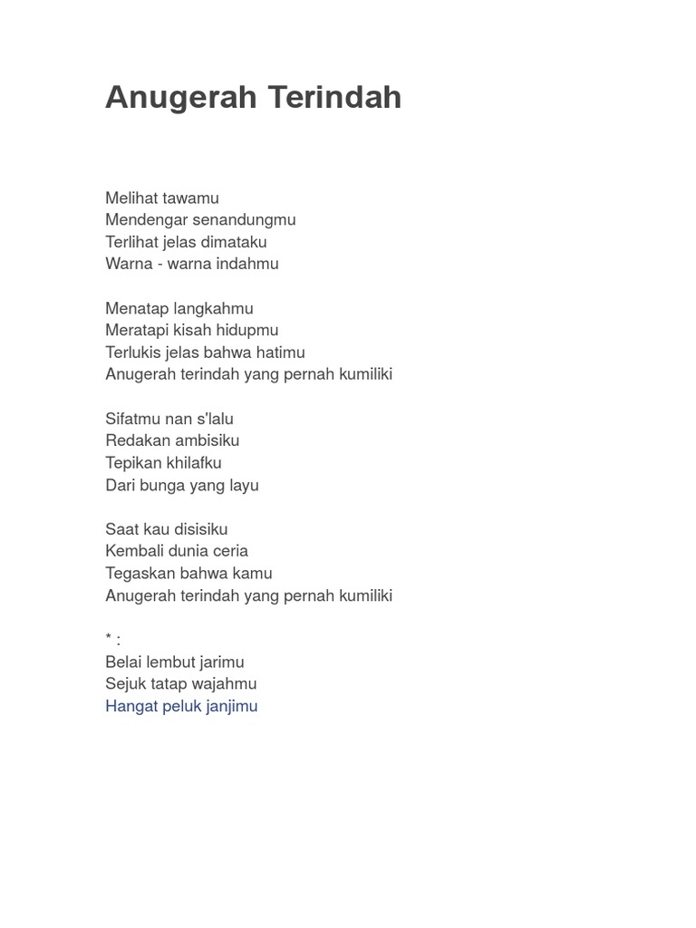 Ucapan cinta menghiris kalbu. Hadirnya mu mengikis sepi. Aku bagai seorang Kembara jalanan Terumbang ambing Di lautan gelora Mencari kebahagiaan Dahan untuk menumpang kasih Mungkinkah suratan Hidup kau selalu keseorangan.